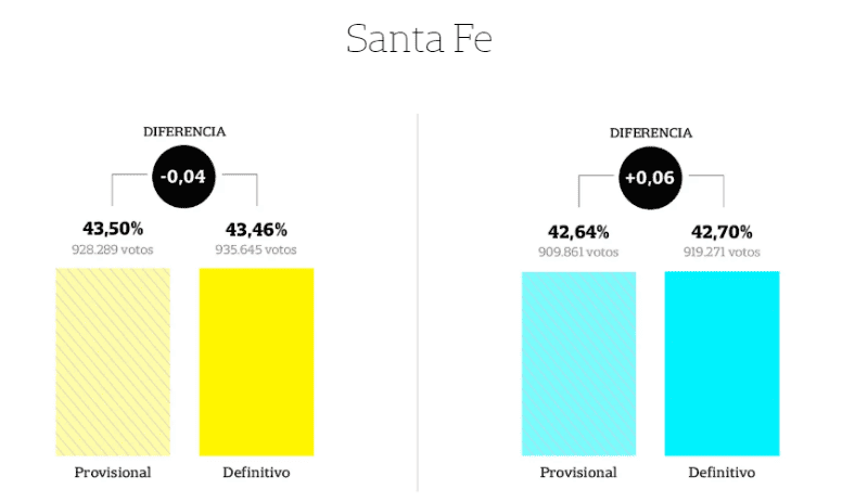 Tampoco hubo cambios sustanciales en Santa Fe, donde el actual jefe de Estado bajó apenas 0,04% y se quedó en 43,46. Mientras que Fernández sumó 0,06 y alcanzó a 42,70. La diferencia final fue de menos de un punto: 0,76%.