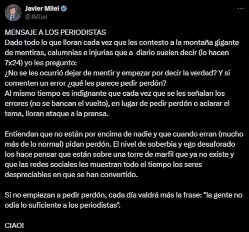 El ministro de Economía se sumó a lo que ya es una seguidilla de publicaciones diarias de Milei, funcionarios o figuras cercanas a él y sus seguidores contra la prensa en redes sociales. Hace tan solo dos días, el Presidente publicó un nuevo mensaje donde afirmó que “la gente no odia lo suficiente a los periodistas”.