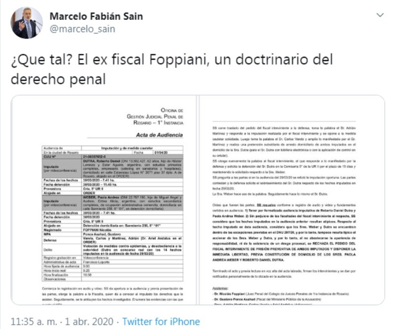 "¿Qué tal? El ex fiscal Foppiani, un doctrinario del derecho penal", escribió Sain y adjuntó las imágenes del acta de la audiencia realizada en la mañana de este miércoles a través de videoconferencia, medida dispuesta en el marco de la pandemia del coronavirus.