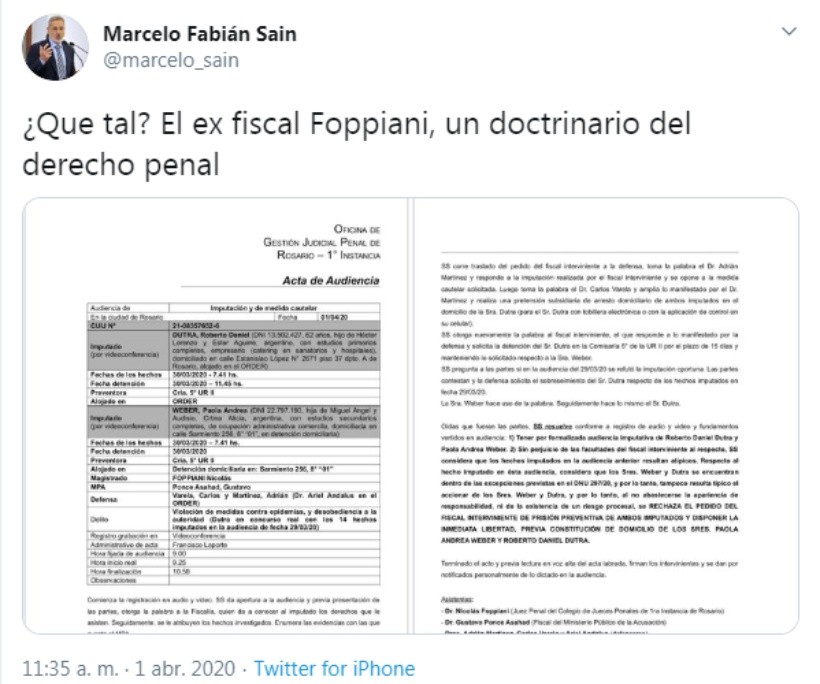 El ministro de Seguridad de la provincia Marcelo Sain realizó un polémico tuit después de la liberación del empresario gastronómico Roberto Daniel Dutra ordenada por el juez Nicolás Foppiani, claramente disconforme con la resolución. El funcionaro publicó el acta de la audiencia, donde figuran los datos personales y las direcciones de las dos personas acusadas de violar la cuarentena total.