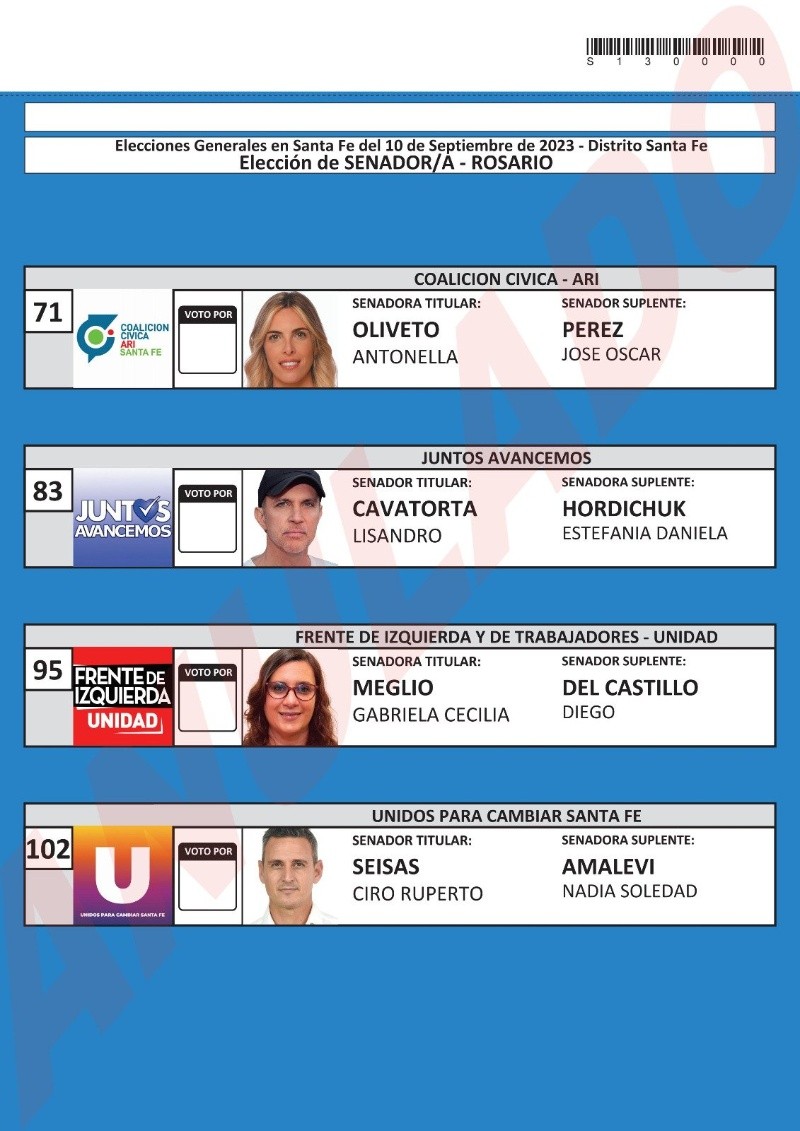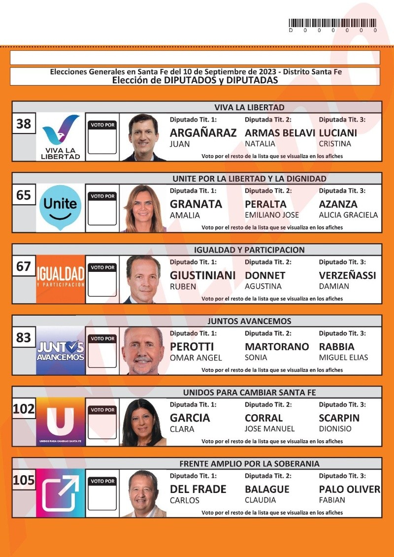 Finalmente, para las categorías diputados provinciales (naranja) y senadores departamentales por Rosario (azul) las boletas serán las siguientes: