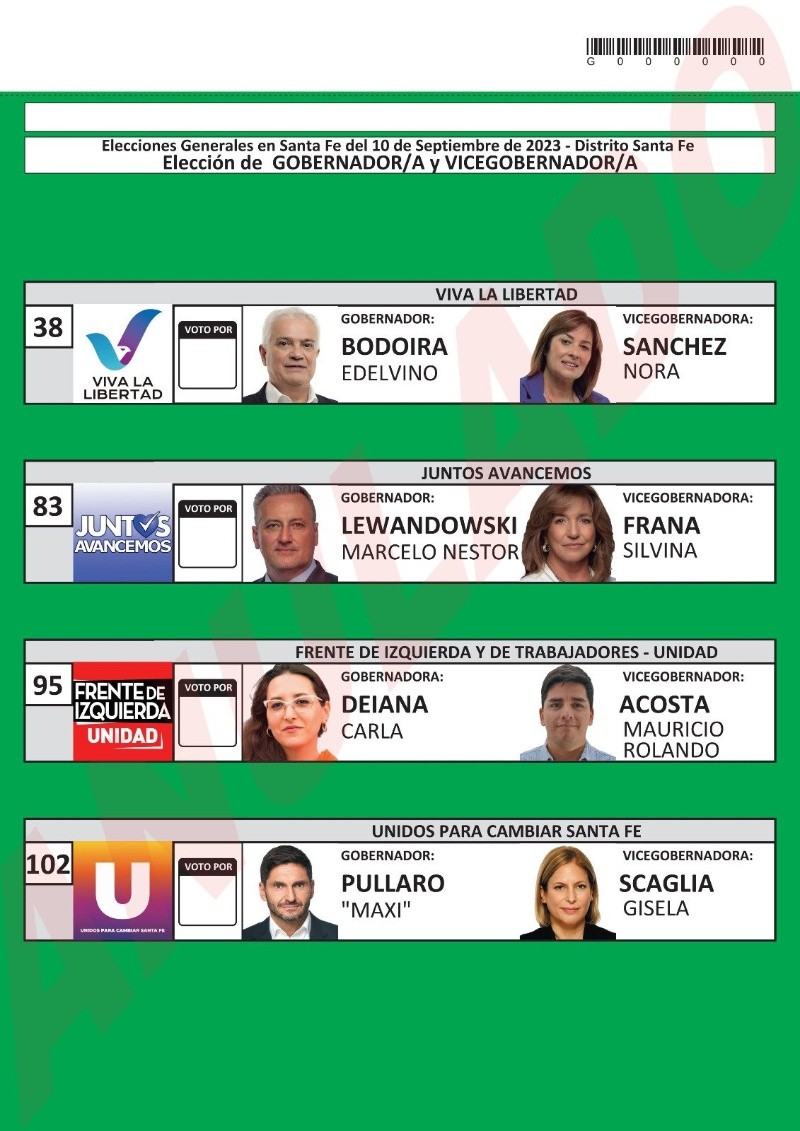 La boleta de la categoría gobernador, de color verde, tendrá los cuatro candidatos que competirán para gestionar Santa Fe desde el 10 de diciembre: Edelvino Bodoira, Marcelo Néstor Lewandowsky, Carla Deiana y “Maxi” Pullaro, en ese orden y con esa denominación.