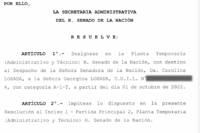 El 19 de septiembre la senadora Carolina Losada opinó sobre la decisión para que pasen a planta permanente 128 trabajadores que venían cumpliendo funciones desde hace tiempo en el Senado de la Nación. Dijo: "Es una forma de robarle a la gente". Pero en las últimas horas se conoció un documento en redes sociales donde la periodista designa a la hermana como integrante de su despacho.
