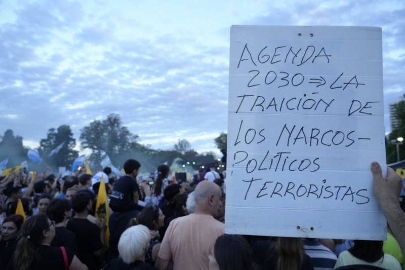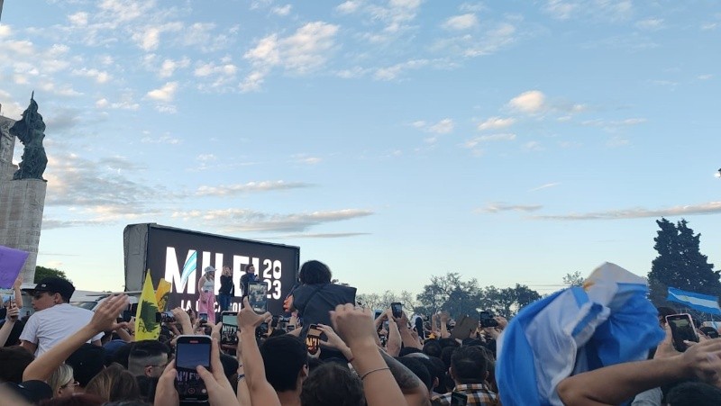 A las 17 el calor apretaba un poco. El atardecer, pronto se tragaría algo de sol dejando paso a un reconfortante aire ribereño. A pocos metros del mástil mayor, estaba dispuesto el escenario con una pantalla gigante con imágenes de Milei. Ya se habían congregado cientos de militantes y fieles seguidores del “León”, muchos en familias, vestidos con remeras del partido o usando pañuelos amarillos con el logo del felino, que se vendían a mil pesos cada uno. Mucho celeste y blanco en medio del violeta libertario. Nada diferente a otras concentraciones partidarias con gente ilusionada y expectante, buscando un lugar donde asentarse, cargando carteles alusivos. O también, leones de peluche. Como fue el caso de Andrea, una rosarina de 53 años que se había acercado con sus dos hijas adolescentes. “Hay que renovar la política, que se vayan todos estos corruptos que no sirven para nada, las pruebas están a la vista. Todos dicen que es loco. Bueno, yo prefiero el loco antes que el chorro y un futuro para mis hijas en este país donde he nacido y donde se han criado”, sostuvo y advirtió que una de las chicas “está pensando irse”.