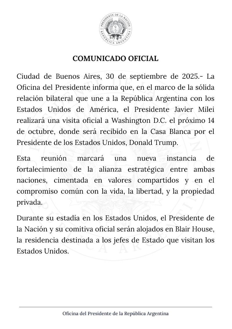 "La Cancillería de la República Argentina informa que, como muestra de la excelente relación bilateral que une a la República Argentina y a los Estados Unidos de América, el próximo 14 de octubre el Presidente de la Nación, Javier Milei, realizará una visita oficial a los Estados Unidos y tendrá el honor de ser recibido en la Casa Blanca por el Presidente Donald J. Trump", indicó el Gobierno argentino.