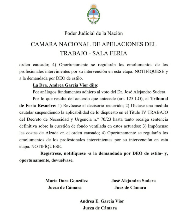 "Díctase una medida cautelar suspendiendo la aplicabilidad de lo dispuesto en el Titulo IV Trabajo del Decreto de Necesidad y Urgencia n.° 70/23 hasta tanto recaiga sentencia definitiva sobre la cuestión de fondo ventilada en estos actuados", decidieron los jueces en el marco del expediente inaugurado a partir de una presentación de la CGT.
