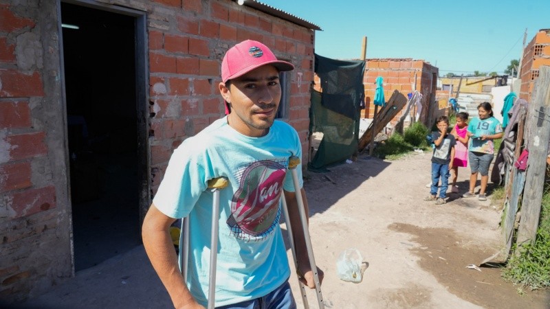 En otro pasillo, en un terreno donde ya había dos casas, Diego y su pareja, Claudia, levantan la de su familia con ladrillos huecos. El muchacho tiene un yeso en su pierna izquierda.