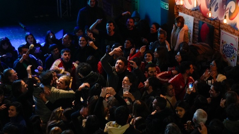 A 700 metros, el Distrito 7 ya está a reventar y no cabe un alfiler. El triunfo que se palpaba en las urnas ahora es una realidad. Entre porrones, latas de cerveza y pizzas, los abrazos se convierten en uno solo que concentra la felicidad de una noche que no van a olvidar fácilmente. Moverse de un punto a otro es casi imposible y demanda mucha paciencia.
