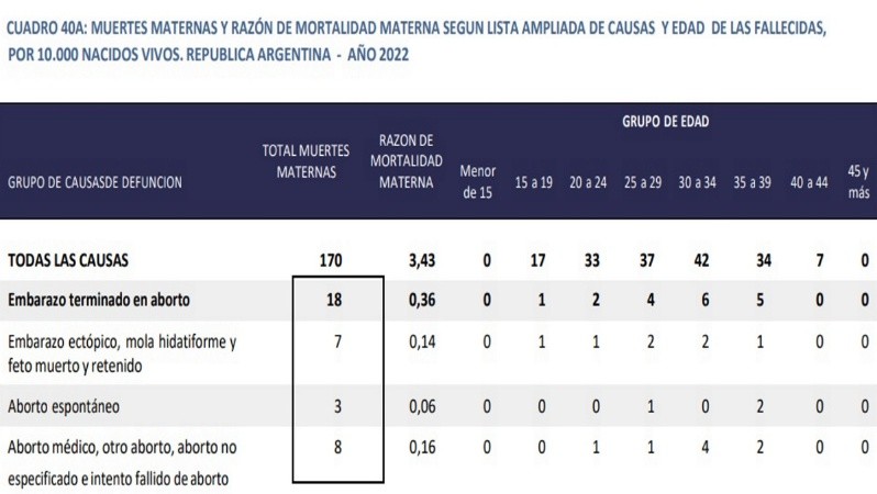 En la página 133 del mismo, consta una tabla donde se detalla la estadística relacionada con las muertes maternas y las causas de defunción en 2022. De ese registro oficial surge que la cantidad de muertes maternas a causa de embarazos terminados en aborto médico, fue de 8 casos. Es decir: 5 menos que en 2021.