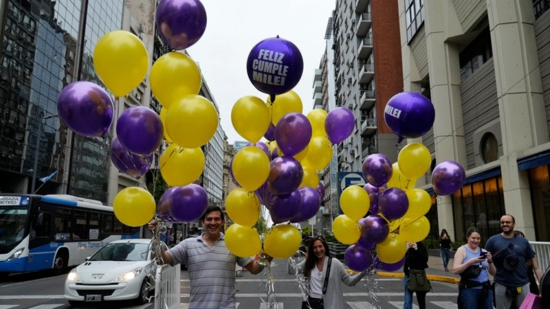 Llegan globos amarillos y violeta. Le cantan el feliz cumpleaños a Milei. Algunos dicen "Javier" para que rime y otros optan por "El León".