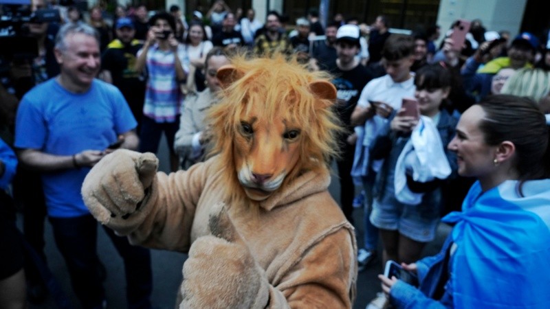 De ese grupo emerge un hombre disfrazado de León que anima a la tropa que espera afuera del hotel. El equipo de Crónica TV le saca todo el jugo posible. "Un rugido, un rugido, otro más", le pide el periodista. Es un momento épico cuando El León se cruza con Jason.
