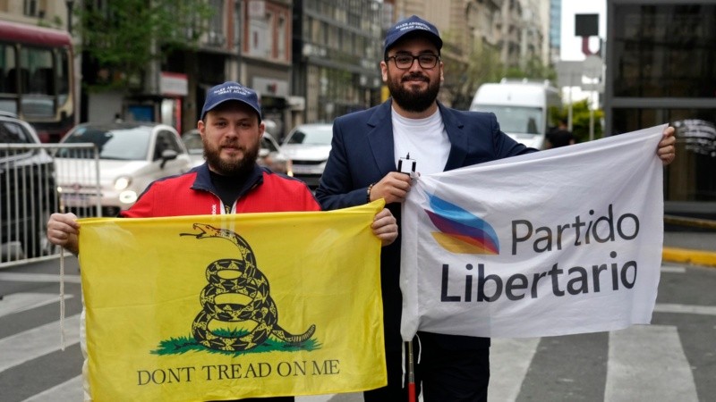 Llegan con sus gorras de "Make Argentina great again", un homenaje a la campaña de Donald Trump en Estados Unidos, Gastón (35 años, referente del Partido Libertario en Caba, camperita Reebok azul y roja) y Tomás (27 años, dirigente de ese espacio pero de provincia de Buenos Aires, saco y pantalón azul, remera blanca y alpargatas bordó).
