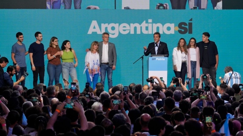 Con música de Trueno de fondo y cánticos de la militancia, el ministro de Economía y candidato presidencial más votado de este domingo, Sergio Massa, se subió al escenario del búnker de Unión por la Patria en Chacarita con un mensaje pro familia y antigrieta, bien distinto al que se le escuchó a su rival en el balotaje de noviembre, Javier Milei en el hotel Libertador. Massa apeló al votante de Myriam Bregman y Juan Schiaretti y a los ciudadanos que “por bronca o desesperanza” no fueron a sufragar. Reiteró que el 10 de diciembre, en caso de resultar electo presidente, armará un gobierno de unidad nacional que “abrace a todos”. Fue un discurso largo en el que, sobre el final, invitó a su familia y a la de su candidato a vice, Agustín Rossi, a subirse al escenario.