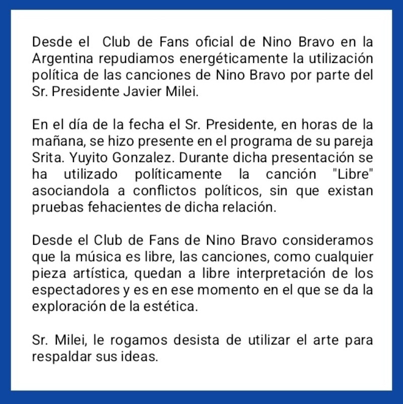 A través de un comunicado publicado redes sociales, los seguidores del cantante español manifestaron: "Repudiamos energéticamente la utilización política de las canciones de Nino Bravo por parte del Sr. Presidente Javier Milei".