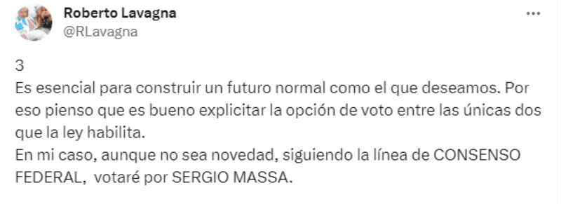 Roberto Lavagna, ex ministro de Economía y actual dirigente de Consenso Federal, confirmó su voto para el balotaje del domingo. “Votaré por Sergio Massa, hay que buscar gobiernos de unidad nacional", explicó. El ecomonista lo expresó este martes mediante un hilo en la red social Twitter, en el que explicó los motivos de su voto al candidato de Unión por la Patria (UP) en el balotaje del próximo domingo. "Como ciudadano he creído y creo que nuestra sociedad necesita, urgente, trabajar en los consensos y buscar gobiernos de unidad nacional para un conjunto de temas claves", comenzó diciendo el ex ministro. También convocó a cerrar la grieta, diciendo que para la Argentina "es esencial cerrar la grieta extremista de izquierda y de derecha", para poder "juntarse en un centro progresista que atraiga e incorpore" a todos aquellos que "se dejaron ganar por la idea de concebir a la política como conflicto permanente".