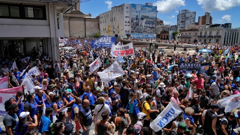 El Movimiento Sindical Rosarino (MSR) llamó a movilizar en rechazo al decreto de necesidad y urgencia (DNU) y a la ley Ómnibus que "destruye los valores constitucionales que hacen posible la convivencia entre los argentinos y argentinas”. Los gremios del MSR se concentraron desde las 11.30 en la plaza 25 de Mayo, frente a la Municipalidad de Rosario.
