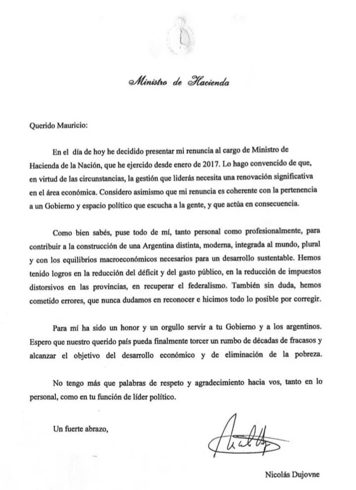 Nicolás Dujovne presentó su renuncia como ministro de Hacienda de la Nación con una carta dirigida al presidente Mauricio Macri en la que afirma que la gestión necesita "una renovación significativa en el área económica".