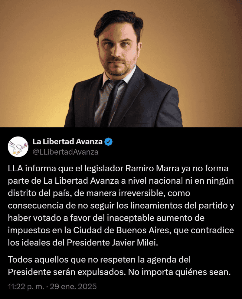 En ese sentido, el comunicado del oficialismo consigna: "LLA informa que el legislador Ramiro Marra ya no forma parte de La Libertad Avanza a nivel nacional ni en ningún distrito del país, de manera irreversible, como consecuencia de no seguir los lineamientos del partido y haber votado a favor del inaceptable aumento de impuestos en la Ciudad de Buenos Aires, que contradice los ideales del presidente Javier Milei".