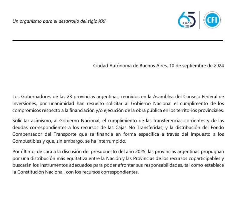 El texto fue publicado tras un cónclave en el Consejo Federal de Inversiones (CFI), en Buenos Aires, al que asistieron jefes provinciales y representantes de los 23 distritos del país, excepto de la Ciudad Autónoma de Buenos Aires (Caba), que no forma parte del organismo. En ese marco, fue reelecto por unanimidad su actual titular, el peronista Ignacio Lamothe, tras una decisión consensuada.