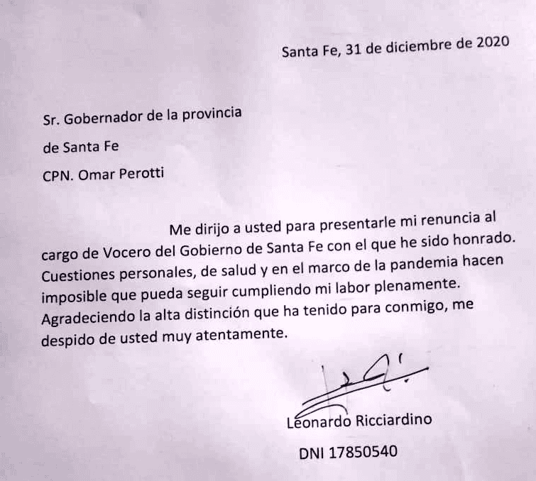 En el texto dirigido al gobernador, Ricciardino explicó: “Cuestiones personales, de salud y en el marco de la pandemia hacen imposible que pueda seguir cumpliendo mi labor plenamente”.