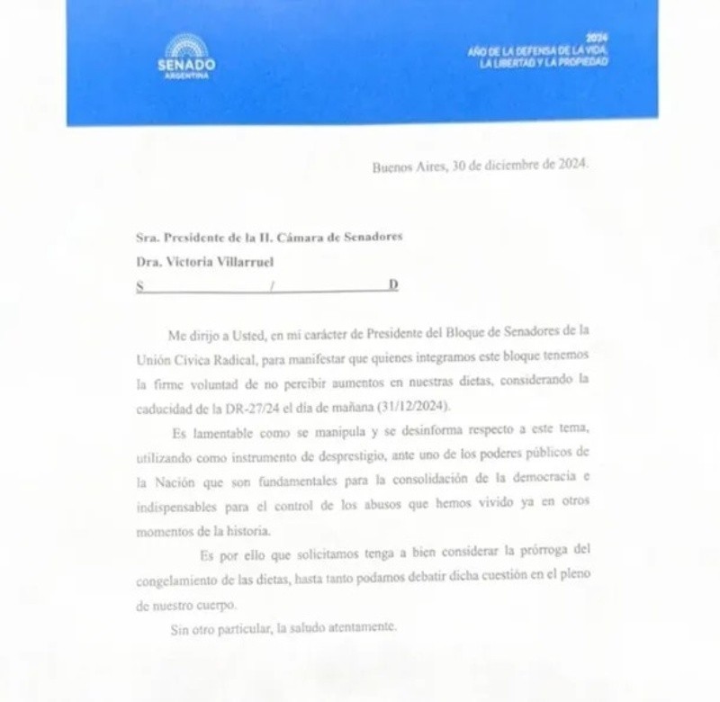 "Me dirijo a usted, en mi carácter de presidente del bloque de senadores de la Unión Cívica Radical, para manifestar que quienes integramos este bloque tenemos la firme voluntad de no percibir aumentos en nuestras dietas, considerando la caducidad de la DR-27/24 el día de mañana (31/12/2024)", señala la carta firmada por el titular del bloque radical.