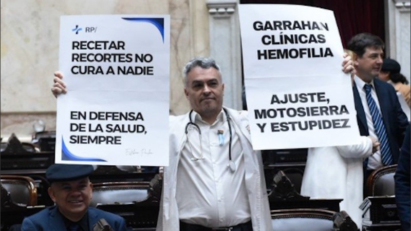 El legislador santafesino se manifestó en favor de la salud pública, con un guardapolvo blanco y un estetoscopio y exhibió carteles en defensa del reclamo de los trabajadores del hospital pediátrico Garrahan: “Recetar recortes no cura a nadie”, “Garrahan, Clínicas, Hemofilia”, “En defensa de la salud siempre” y “Ajuste, motosierra y estupidez”, decían los letreros expuestos por el diputado quien además, al momento de su alocución, denunció la violencia que viene soportando de parte de funcionarios y dirigentes libertarios.