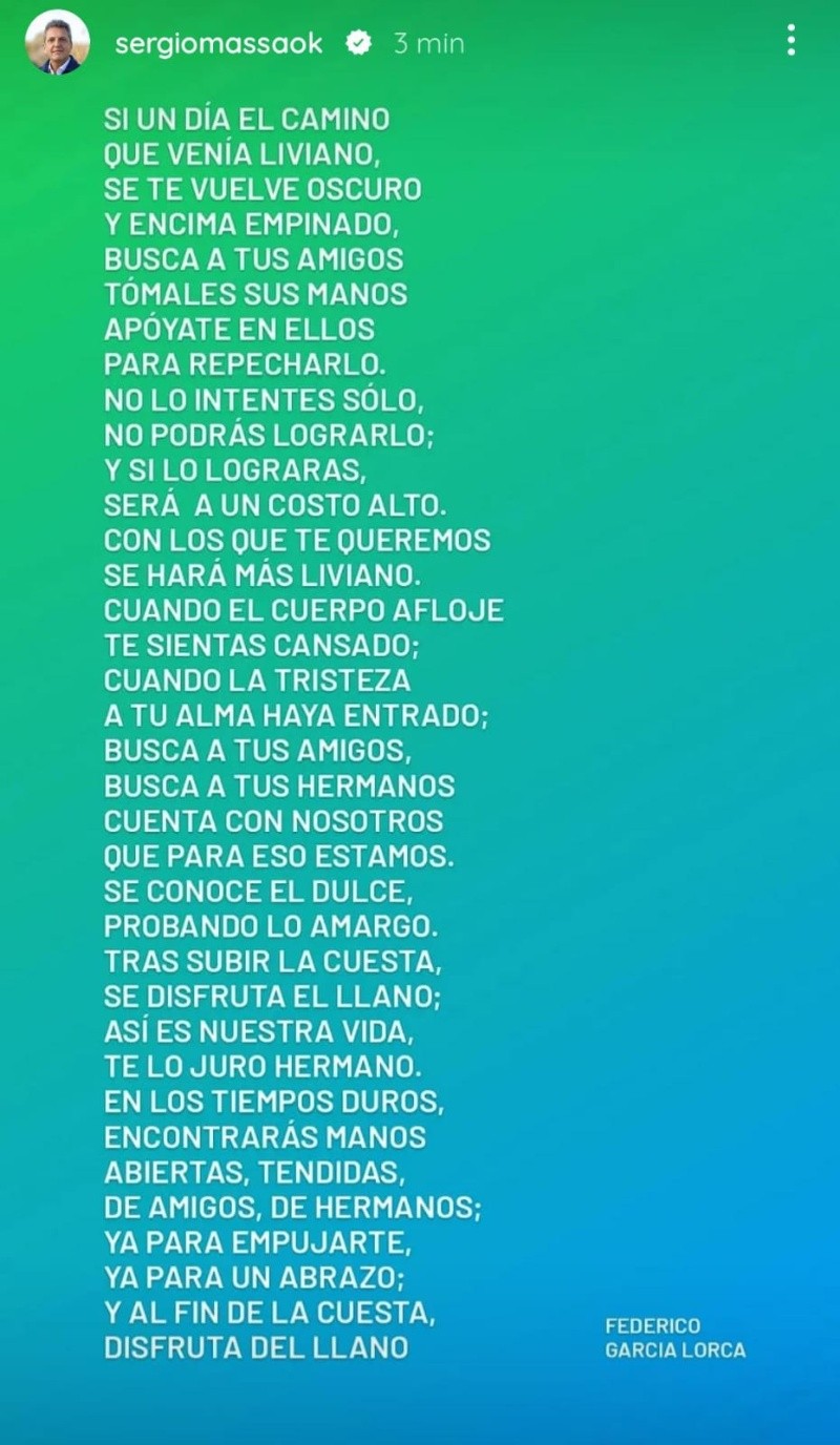 Después de las elecciones nacionales del pasado domingo, en las que Javier Milei se convirtió en el presidente electo, Sergio Massa compartió este martes un poema en sus redes sociales donde dio a entender que tras la derrota se va a refugiar en sus seres queridos.
