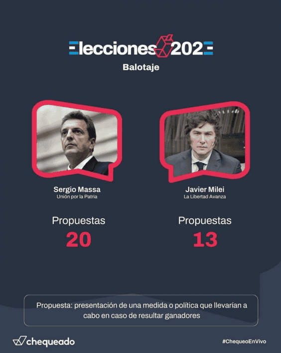 Para conocer las propuestas de Sergio Massa y Javier Milei dar clic en el nombre de cada candidato. Ambos redirigen al sitio de Chequeado con las propuestas y el detalle de cada una.