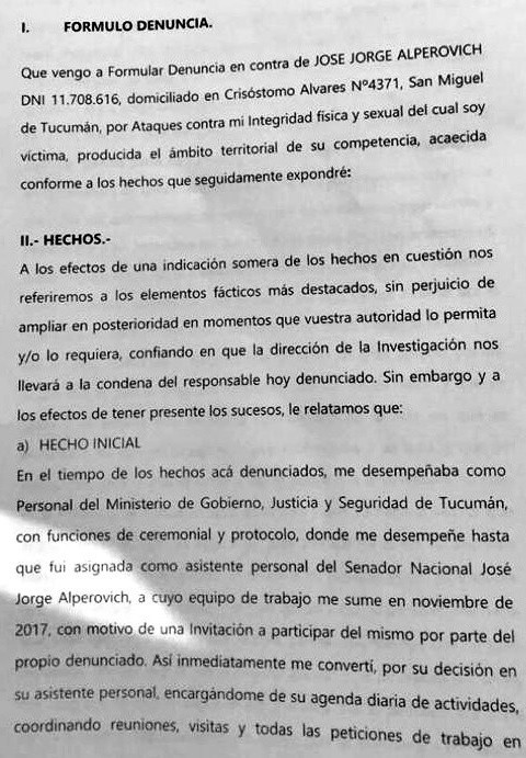 “El mío se llama Jose Jorge Alperovich, mi tío segundo y jefe, por quien fui violentada sexual, física y psicológicamente desde diciembre del 2017 hasta mayo de 2019. Durante un año y medio sufrí violaciones a mi integridad física y sexual. El avasallamiento fue demoledor. Tanto que ni siquiera pude ponerlo en palabras. Él oscilaba libre y cómodamente en los tres escenarios ante los que me posicionaba: el familiar, el laboral y el del horror de la intimidad que me forzaba a vivir con él”, sigue.