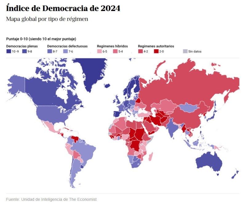Aunque 2024 fue un año récord en elecciones, con casi la mitad de la población mundial acudiendo a las urnas, el Índice de Democracia de la Unidad de Inteligencia de The Economist (EIU) registró un nuevo retroceso, y alcanzó su nivel más bajo desde su creación en 2006. La puntuación promedio cayó de 5,23 en 2023 a 5,17 y refleja una preocupante tendencia global de estancamiento o reversión democrática.