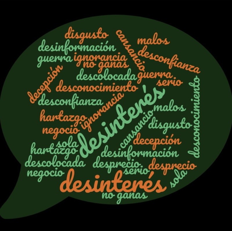 “Los políticos lograron que la gente se desinterese del tema o ignore qué se vota”, “hay desprecio por valores tradicionales como la participación electoral”, “hay gente de mi generación que vota a candidatos que dicen cualquier cosa porque les parecen graciosos”, “la política ya no se toma como algo serio”, “la juventud está descolocada y sola”, “hay mucha desinformación y desconocimiento en la propia casa”, “no hay ganas”, “hay desinterés, decepción, disgusto”, “pérdida de esperanza en ser representados”, “cansancio”, “les da lo mismo”, “malos mandatos anteriores generaron desconfianza”, “no los convence ningún candidato”, “hartazgo, la gente percibe la política como algo que no ayuda”, “la política se transformó en negocio”, “parece más una guerra que una decisión”.