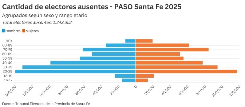 Las elecciones Paso del domingo 13 de abril en la provincia de Santa Fe dejaron un dato para analizar: apenas el 55,6% del padrón electoral participó del comicio. Este porcentaje representa el nivel más bajo de asistencia a las urnas desde el retorno de la democracia en 1983, superando incluso el anterior récord negativo registrado en las Paso de 2023, cuando votó el 62,7% del electorado. Lejos de mejorar, en las generales del 29 de junio, la asistencia de electores volvió a caer y se ubicó en 48% en la provincia. Rosario3 accedió a información detallada del Tribunal Electoral sobre ausentismo, que permitió desgranar algunos datos, como edades y género de quienes no concurrieron a las urnas, a pesar de estar habilitados a sufragar.