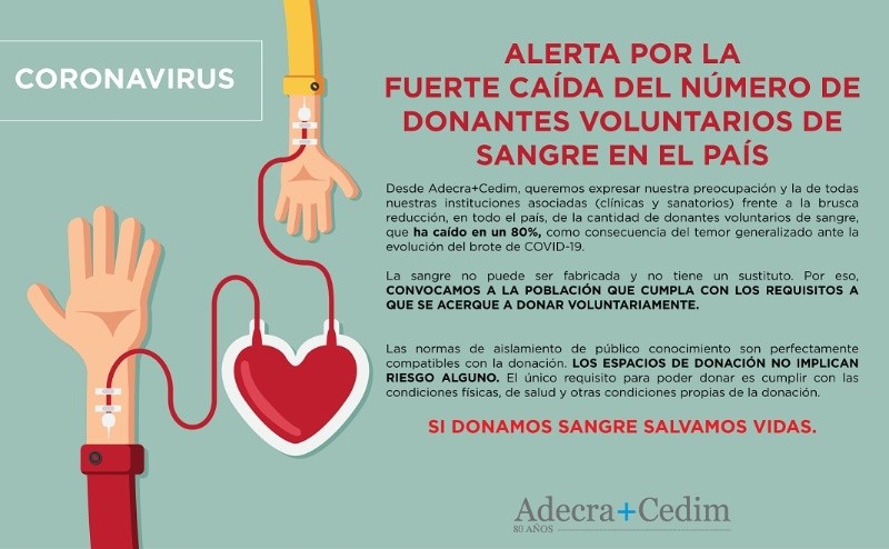 Debido a las medidas de aislamiento dispuestas frente al avance del coronavirus, el número de personas que donan de forma voluntaria descendió en un 80% a nivel nacional y generó la preocupación en Adecra+Cedim, la cámara nacional que nuclea a prestadores de la salud privada como clínicas, sanatorios, laboratorios y centros de diagnóstico.