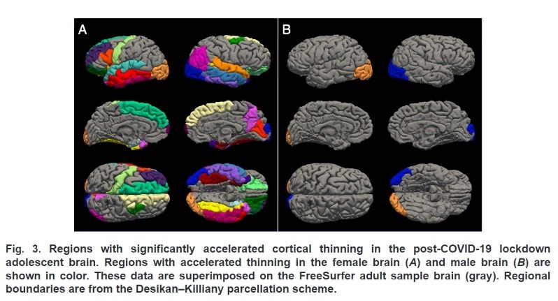 El trabajo, que se publicó en la revista Proceedings of the National Academy of Sciences (PNAS), evaluó parámetros de desarrollo del cerebro en adolescentes antes y después de los confinamientos declarados en Estados Unidos por la pandemia, y encontraron muestras de que los cerebros de niñas se avejentaron más rápido de lo esperado, un efecto que relacionaron con el aislamiento social.
