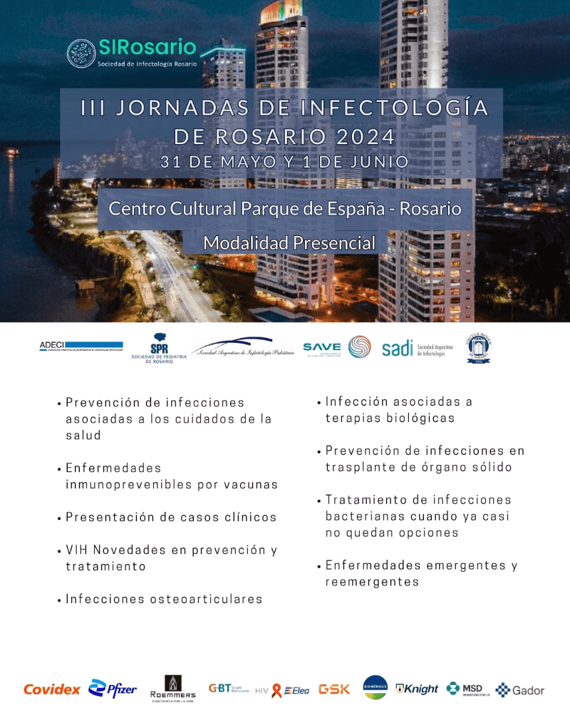 Este viernes 31 de mayo y 1º de junio se llevarán a cabo dos jornadas de infectología en el Centro Cultural Parque España que contará con la presencia de destacados disertantes y panelistas locales y nacionales. El encuentro está orientado a médicos clínicos, generalistas, intensivistas, pediatras, microbiólogos e infectólogos.