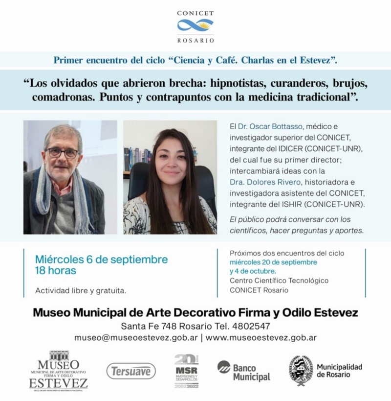 Todo ello será puesto en diálogo en el ciclo "Ciencia y café", que tendrá su primer encuentro el próximo miércoles 6 de septiembre desde las 18 en el Museo Estévez (Santa Fe 748, Rosario). Esta primera jornada llevará el título de "Los olvidados que abrieron brecha: hipnotistas, curanderos, brujos, comadronas. Puntos y contrapuntos con la medicina tradicional".