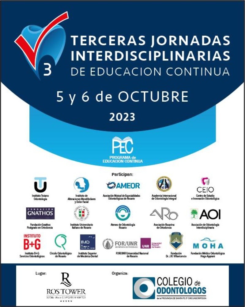 Las Jornadas Interdisciplinarias de Educación Continua para odontólogos tendrá su tercera edición tras la interrupción de su frecuencia a raíz de la pandemia por Covid-19. Las mismas, dirigidas a colegiados y colegiadas de todo el país, implican reuniones científicas de actualización. Tendrán lugar el jueves 5 y viernes 6 de octubre en la sala de convenciones del RosTower (Mitre 299).