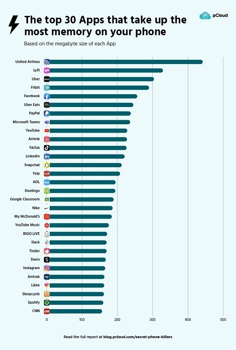 Combinando todos los resultados, el análisis conformó una lista en la que Fitbit, Verizon, Uber, Skype y Facebook ocuparon los primeros cinco puestos. La app de United Airlines es la que más almacenamiento ocupa, requiriendo 437,8MB de espacio. La sigue Lyft, con 325,1MB de espacio, y Uber con 299,6MB.