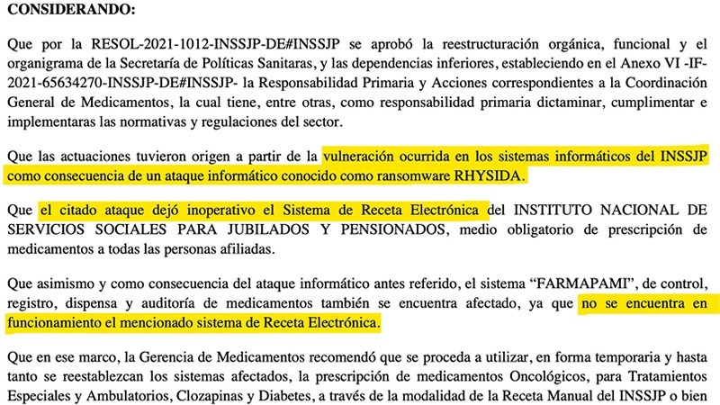 A estas violaciones de seguridad hay que sumarle la más reciente: el ciberataque que desde las primeras horas del martes dejó fuera de servicio al Pami a nivel nacional. La entidad fue víctima de un ransomware, un tipo de software malicioso que encripta la información impidiendo el acceso y exige un pago a cambio de su liberación. Detrás de este golpe está el grupo Rhysida, una organización de ciberdelincuentes que apareció en escena a fines de mayo pasado y que toma su nombre de un tipo de ciempiés que habita en distintas partes del mundo.