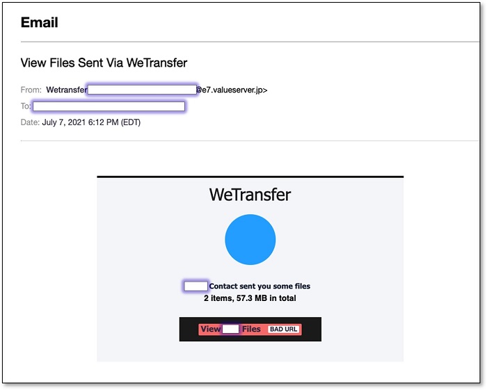 La metodología consiste en enviar un correo electrónico simulando que se trata de un mensaje de WeTransfer, una plataforma que permite compartir archivos de gran tamaño y puede ser utilizada tanto en entornos personales como empresariales.