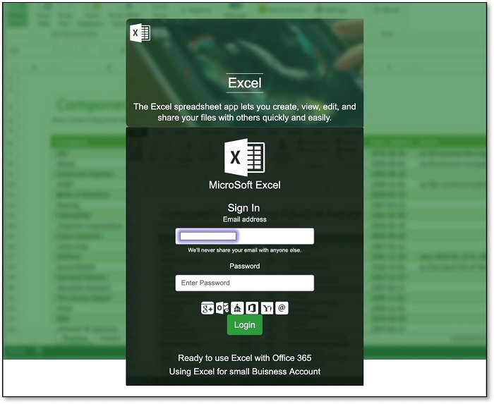 De ser así, el usuario es redireccionado a un sitio que simula ser de Microsoft, con una hoja de cálculo difuminada en el fondo y un falso formulario de Excel en primer plano, en donde se solicita la dirección de correo y la contraseña para acceder al contenido.
