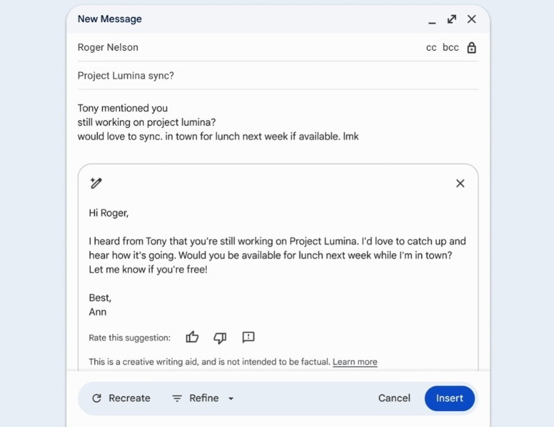 Google también habilitó el uso de la característica "Ayúdame a escribir" en su servicio de correo electrónico, que funciona a través de Gemini, la inteligencia artificial (IA) de la compañía. Esta característica permite a los usuarios reescribir sus correos electrónicos con ayuda de la IA, para darles un estilo más profesional, corregir faltas de ortografía o lograr textos más coherentes. La edición con IA puede activarse en la versión web de Gmail con el comando Ctrl + H, aunque de momento solo están disponibles para usuarios del plan AI Premium de Google One. En el caso de la versión móvil, será necesario deslizar el dedo sobre la pantalla para que la IA muestre el texto alternativo.