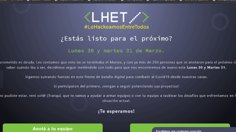 “Sigamos sumando fuerzas en este frente de batalla digital para combatir al Covid19 desde nuestras casas”, es el llamado del evento, bautizado Lo Hackeamos entre Todos (LHET).