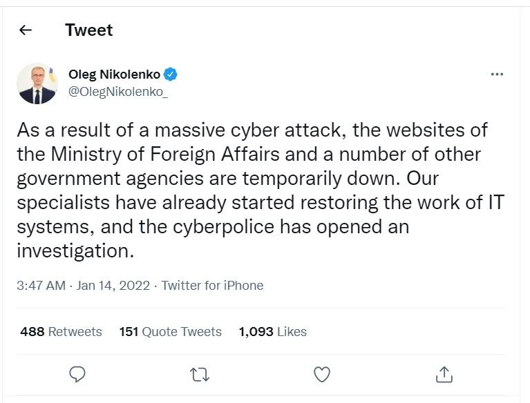 En la noche del 13 al 14 de enero, al menos 70 sitios web pertenecientes al gobierno ucraniano fueron hackeados en un ciberataque coordinado. Las páginas del Gabinete de Ministros y de los Ministerio de Defensa, Relaciones Exteriores, Educación y Ciencias, Agricultura, Energía, Medio Ambiente y varios otros fueron borrados y su contenido reemplazado por un mismo mensaje publicado en ruso, ucraniano y polaco: