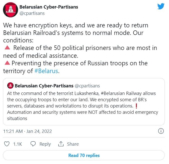 La respuesta llegó poco más de una semana después, cuando un grupo de hacktivistas autodenominado Cyberpartisans atacó con ransomware (un tipo de malware que cifra los archivos y exige el pago de un rescate para poder acceder a ellos) la red de ferrocarril de Bielorusia, buscando así detener el traslado de material militar desde Rusia hacia la frontera con Ucrania. El ataque no solo interrumpió la circulación de cargas, también afectó la venta de pasajes y el acceso a diferentes servicios. En una publicación en su grupo de Telegram, señalaron que atacaron decenas de bases de datos para ralentizar e interrumpir el sistema ferroviario y que además destruyeron las copias de seguridad. Sin embargo, el grupo hacktivista aclaró que los sistemas de automatización y seguridad no fueron afectados deliberadamente para evitar situaciones de emergencia. Un representante del grupo subrayó que el objetivo del ataque era presionar al gobierno de Alexander Lukashenko para que libere a presos políticos e impida que las tropas rusas ingresen a Bielorusia para atacar a Ucrania.