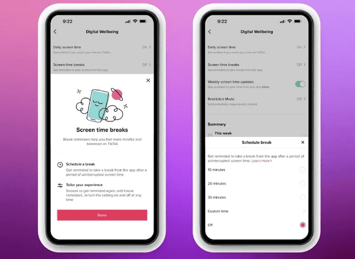 Los usuarios de la aplicación podrán configurar períodos de tiempo de uso de pantalla, pudiendo elegir entre lapsos de 10, 20 o 30 minutos o definiendo otra cantidad manualmente Según comunicó la empresa, esta función llegará "en las próximas semanas" junto con un panel en el que se podrán visualizar estadísticas de uso como el tiempo de pantalla, la cantidad de minutos que se le dedican diariamente a la aplicación y el número de veces que se abre. También se podrá ver el tiempo de uso diurno y nocturno. Además, el Centro de Seguridad de la app también introducirá una nueva guía: "¿Cómo puedo reflexionar sobre mi bienestar digital con mi familia y amigos?". Su objetivo será que la comunidad de usuarios sea consciente de la forma en que pasa el tiempo conectada a Internet. Para los usuarios menores de edad, la plataforma introducirá avisos digitales semanales. También mostrará un mensaje cuando se haya utilizado la aplicación durante más de cien minutos en un solo día que les recordará la herramienta de límite de tiempo en pantalla la próxima vez que abran la app. Neurólogos investigadores de la Universidad Zheijang, China, publicaron en agosto del 2021 un estudio sobre cómo actúa esta red social en el cerebro de sus usuarios para lograr una elevada adicción. En la encuesta participaron 208 personas de entre 17 y 31 años. La mayoría de ellas (67%) usaba TikTok menos de una hora al día; el 30%, entre una y dos horas al día; y una pequeña parte (3%) usaba la aplicación más de dos horas al día. La conclusión de este estudio, que se basó en neuroimágenes de las áreas cerebrales, es que el algoritmo de recomendación de TikTok "es capaz de descubrir contenidos que regulan la actividad de un conjunto de subregiones de la red neuronal por defecto y del área tegmental ventral (donde se libera dopamina) para reforzar el comportamiento de ver vídeos". Otra investigación, publicada por The Wall Street Journal, se sirvió de la creación de 100 cuentas automatizadas (bots) que "vieron" millones de videos en la app. "La experiencia de TikTok comienza de la misma manera para todos, con una variedad de vídeos, muchos de ellos con millones de visitas", comentaron. La app "toma nota de las señales sutiles, como el tiempo que se queda en un vídeo, para operar en lo que los usuarios realmente quieren ver". Con el tiempo, las opciones fueron "menos convencionales, menos examinadas por los moderadores y, a veces, más perturbadoras", apuntaron desde el citado medio.