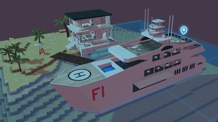 El yate que se puede recorrer dentro del mundo virtual con aspecto de bloques consta de cuatro plantas y está equipado con helipuertos y un jacuzzi, entre otras prestaciones.