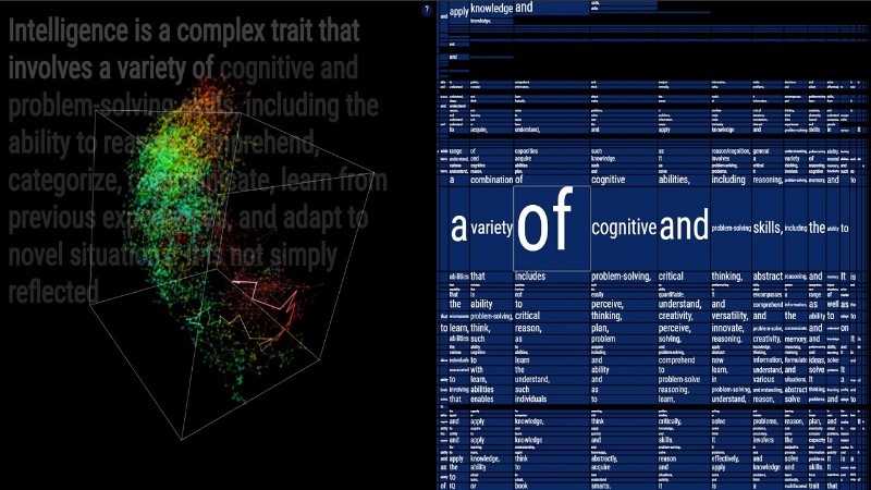 A través de uno de sus proyectos, titulado Mind, Ortiz representó de manera visual el método probabilístico basado en palabras (o tokens) con el que ChatGPT genera texto.
