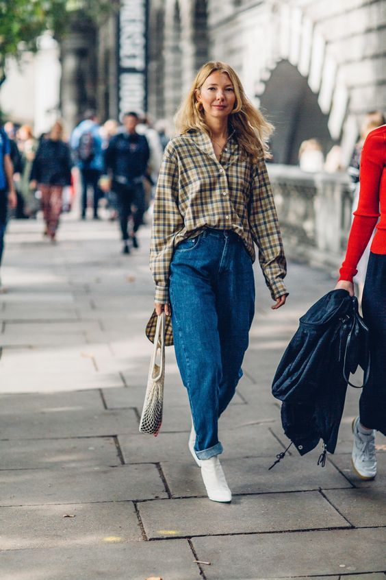 Camisa a cuadros, mom jean y botas blancas (pinterest.com)