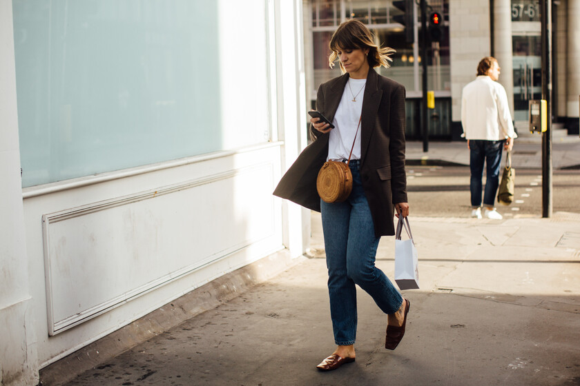 Camisa lisa, jeans rectos, mocasines y blazer (trendencias.com)